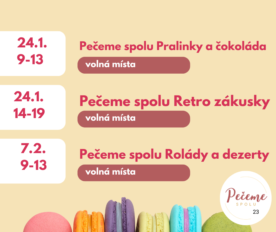 13. a 14. prosince budeme péct pracičky, linecké cukroví s marmeládou a čokoládou a vanilkové rohlíčky. Domů si odnesete cca 3 kg cukroví.